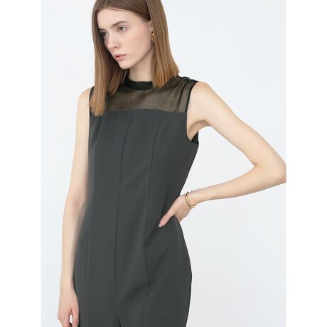 身頃は落ち着きのあるマットなポリエステル素材を、デコルテ部分はシアー感が美しいオーガンジー素材を使用。しなやかな落ち感と適度な肉感を持ち併せることで、ボディラインを拾わず安心してご着用いただけます。