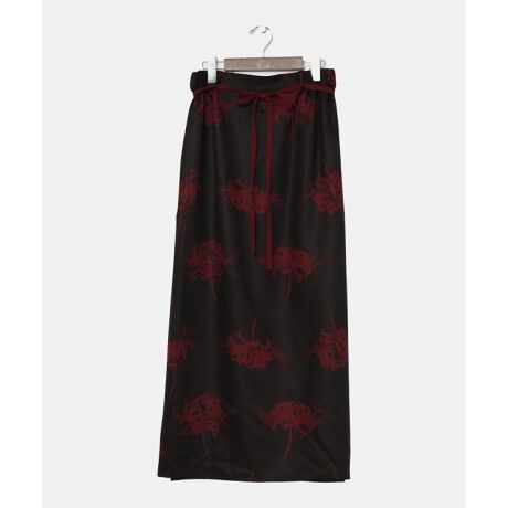 [型番:7CQ-4305-2024]「彼岸花」「コウモリ」「ざくろ」柄を、現代的な色彩で大胆に描いたスカート。トップスと合わせてセットアップで着用すれば、スタイリッシュな和装カジュアルが完成。両サイドポケット付き。
