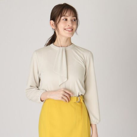 ジャージ素材を使用し、ブラウス見えのきちんと感あるデザイントップス。