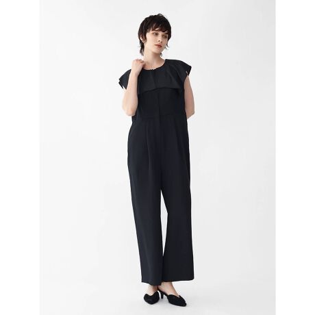デコルテのラッフルが顔周りを華やかに装う、オールインワン。女性らしさを引き立たせながら、ブラックワントーンで上品且つモードに仕上げました。高めのウエスト切り替えからつづくダーツ、優雅なワイドシルエットなど計算されたシルエット美が魅力。胸元のジップ開閉でスムーズな着脱が叶い、着用を後押しします。