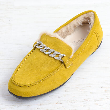 ・カジュアルになりがちなモカシンに、キラキラのビジューチェーンを付けてお出かけ仕様にクラスアップ。