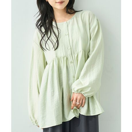 胸下でギャザーを寄せたペプラム切替えデザインと、袖口のゴム仕様がほどよいメリハリをプラス。