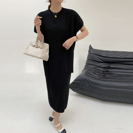 ミモレ丈ワンピースに半袖ショールカーディガンのニットセットアップが新作登場
