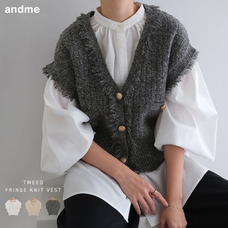 ツイード編み Vネック フリンジ ニット ベスト