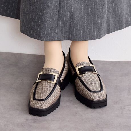 トゥ先がやや長めのラストを採用し、すっきりとしたスクエアトゥシルエットでモードな印象のローファー。