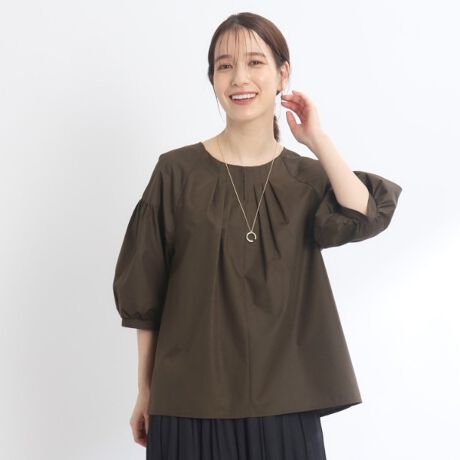 襟ぐりのタックデザインがポイントの華やかなブラウス。