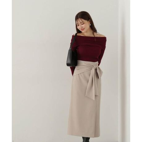 アシンメトリーなリボンが目を引くラップ風デザインのタイトスカート。リボンは結んで調節できる仕様。後ろウエストはゴム仕様なのでラクなはき心地です。<素材>微ストレッチの入った綺麗めなツイル素材を使用しています。<詳細>仕様・後ろファスナー裏地・あり透け感・なし / 光沢・なし / 伸縮性・ややあり 生地の厚さ・普通※モデルの着用画像の場合、光の当たり具合により、実際の色味と異なって見えることがございます。色味は、商品単体の画像をご参照ください。