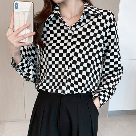 カジュアルでありながらもレトロな雰囲気が漂う柄シャツブラウス