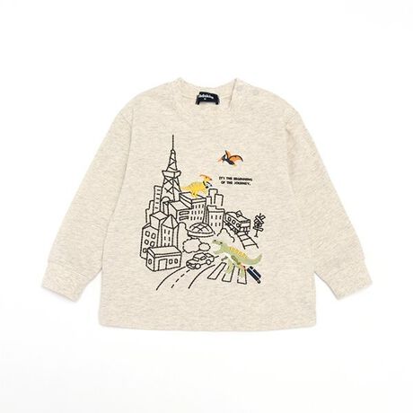 街並みは発泡プリント、恐竜部分は刺しゅうで立体的に表現。