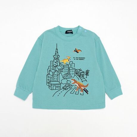 街並みは発泡プリント、恐竜部分は刺しゅうで立体的に表現。