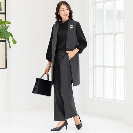 Vネックタイプのロング丈ジレと、ワイドパンツのセットです。