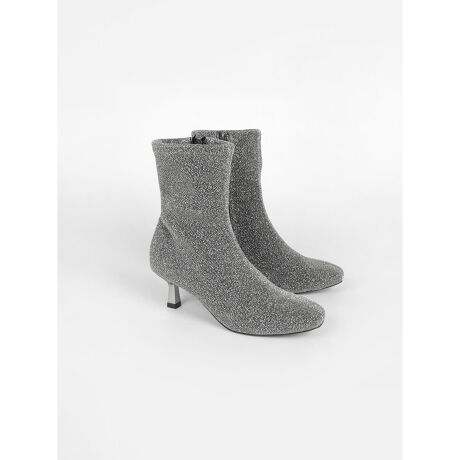 ラメ糸を施した煌びやかなデザインのヒールブーツ。