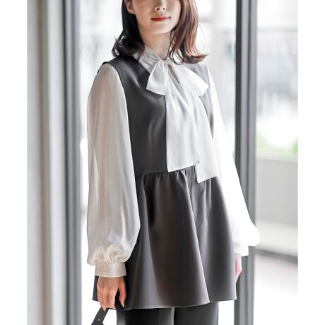 ウエストのギャザー切り替えで広がるペプラムデザインで女性らしさを演出します。