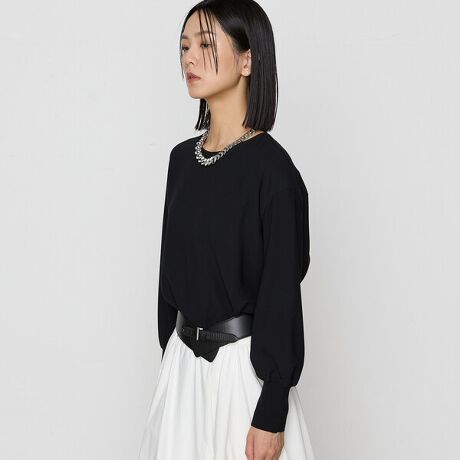 シンプルなラウンドネックのプルオーバーの袖口にロングリブでワンポイントをプラスしています。