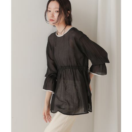ライトな着心地と上品なルックスで初秋のキレイめスタイルを叶えるオーバーブラウスが登場です♪ウエストはアーチ状に切り替えて、ゴムを入れることにより きゅっとしたシルエットを叶えます。下半身をすっぽりと隠す嬉しいチュニック丈で、さらっとイージーな着心地も魅力的◎。襟元と袖口にパイピングをあしらい、フェミニンなデザインの中にもメリハリのある印象になりました。背中のエレガントな涙あきもポイントです。