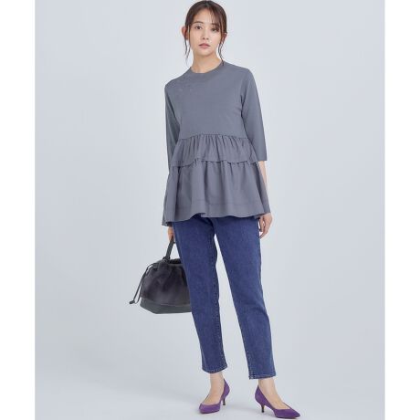 ■デザイン一枚で着映えする華やかなティアードニットTEEです。フィットしすぎないすっきりとしたシルエットのシックでモダンな半袖のトップに、ハリのある別布でタックのティアード切り替えを施し、裾に向かってふわっとしたAラインシルエットが大人の可愛らしさを演出します。トップとの切り替え位置を体から離すことでボディラインをほどよく隠してくれます。やや低めのハイネックは少しだけハンサムな要素をプラスし、通常のティアードディテールと違い、カジュアルすぎない大人っぽい印象に仕上げています。1枚でさらっとサマになり、キレイ目な着こなしはもちろんデニムなどボーイッシュなアイテムとの相性も抜群です。