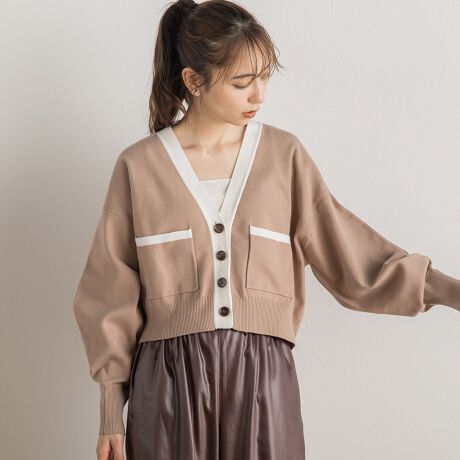 クロップド丈にフォルムスリーブのバランスが可愛いニットカーディガン。