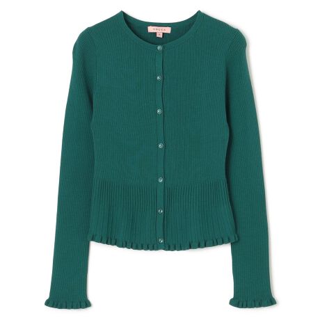 シンプルで合わせやすいデザインの中に、お袖のフリルと裾のランダムなリブ編みをアクセントとして加えた上品なカーディガン。