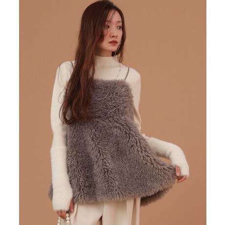今年らしいふわふわディテールが愛らしい フェイクファーがボリューミーなキャミベストです。バスト下から切り替えたペプラムシルエットが可愛らしく、コーディネート全体をフェミニンに仕上げてくれます。華奢なショルダーストラップには お好みで調整可能な嬉しいアジャスター付き。バックスタイルはリボンを2か所結んで頂く仕様で、360度抜かりなくこだわりを詰めました。