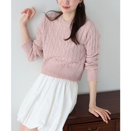 シンプルなボトムに合わせるだけでも、ケーブル編みがアクセントになり華やかな印象。