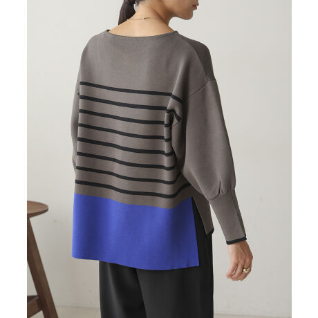 大人のカジュアルコーデをを引き立ててくれるアイテムです。 振り返るとバックスタイルに大胆に切り替えられたバイカラーブロッキングがアクセントになり、コーデを華やかに魅せてくれるニットです。 袖口はスリットが入っており抜け感を演出。