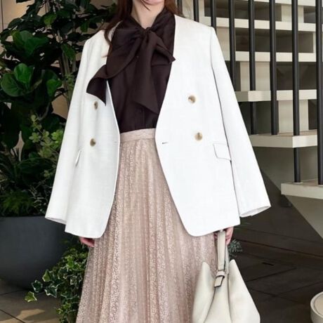 トレンドのノーカラーダブルジャケットです。