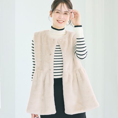 パールボタン×ペプラムシルエットで華やぐ。大人の上品ファーベスト