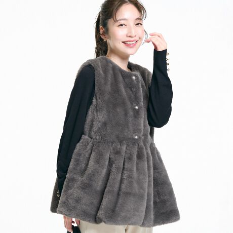パールボタン×ペプラムシルエットで華やぐ。大人の上品ファーベスト