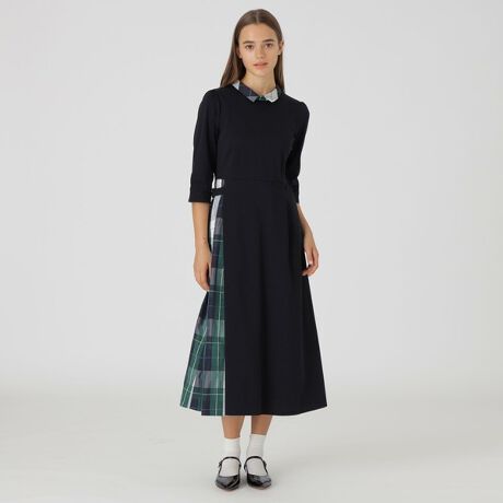 [型番:55J04414__]◆一枚でお洒落が完成するドレス【Design】巻きスカートディテールが新鮮なドレスです。袖丈は上品さを感じさせる5分丈のデザインです。クレストブリッジチェックの小さな衿が顔周りに華やぎをプラスします。脇のベルトで3段階の調整が可能なのでお好みのフィット感で着用いただけます。