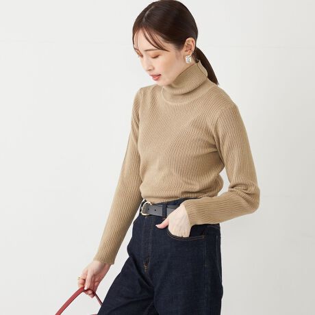 細かいラメがさりげなくきらめく、上品な印象のリブニット。