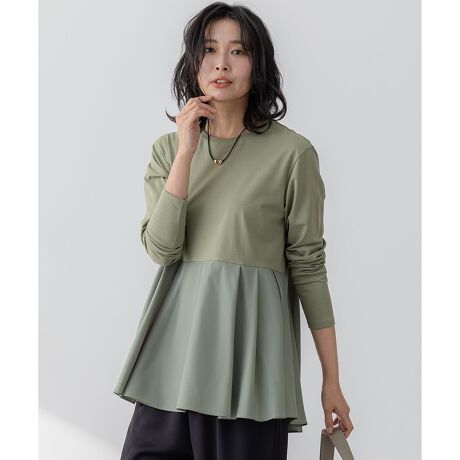 ウエストからしなやかなローンで切り替えた、Aラインに広がるペプラムデザインのカットソー。タックでフレアを贅沢に出した大人っぽいレイヤードインナーです。丈の短めなニットやスウェット、カーディガンなどと組み合わせるのもおすすめ。裾のフレアーをポイントにした、女性らしいレイヤードアイテムとして、長いシーズン活躍するアイテムです。カラーは、ホワイト(#001)、アイボリー(#002)、ブラック(#005)、ダルブルー(#074)の4色に、WEB限定カラーのオレンジ(#020)、カーキ(#054)、サックスブルー(#073)の新色を追加した7色展開です。
