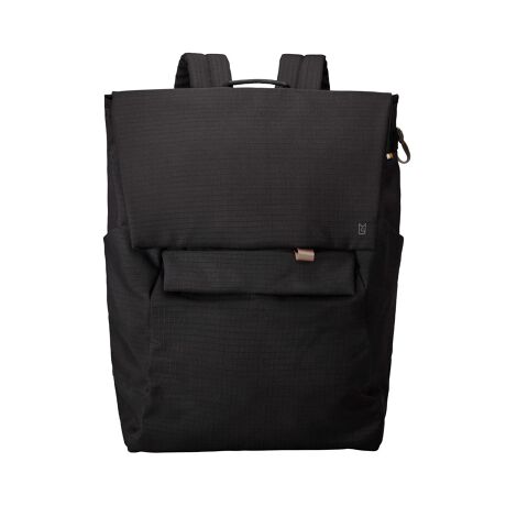 幾何学的デザインを生かした収納力 ダブルフラップタイプのバックパック - 都市建築に着想を得た、幾何学的デザインのフラップバックパック。機能的なダブルフラップ構造、シルエットは大きめのボックス型に。多角形を組み合わせた立体フォルムを生かし、各面にファスナーポケットやサイドポケット、背面ポケットなど用途に応じたポケットを整然と配置することで「収納力」に特化。内部には15インチまでのノートPCが入るクッションポケットや、内装ポケットとしても外付けポーチとしても使える便利な着脱式ポーチを装備。背面にはキャリーハンドルに固定できるベルト付き。生地は撥水加工をした軽量感のあるマットな風合いの300デニールのポリエステル、格子柄が象徴的なリップストップを採用。裏面にPU加工を施すことで強度面をさらにアップしました。カラーはモノトーンで都会的に。バランスを重視したカラーテープがアクセントです。洗練されたデザイン性と実用性で、毎日をもっとアクティブに演出します。