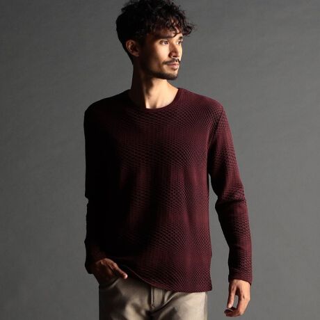 インパクトの強い幾何学柄を無地とモノトーンで表現する事で大人綺麗目なモードテイストに仕上げています。デザインはシンプルなクルーネックタイプ。ジャストサイズでインナーとして、オーバーサイズで重ね着用としても楽しめるアイテムです。