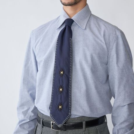 ウール/シルク生地に特徴的な柄の刺繍と縁に手でまつり縫いを施したネクタイ。
