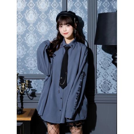 チェーン飾りのついたネクタイ付のビッグシャツ。