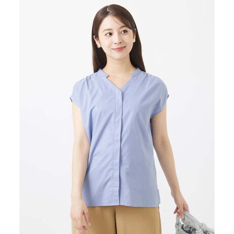 肩に寄せたシャーリングをポイントに、細めの台衿と比翼デザインですっきりときれいめに仕上げたブラウス。程よいハリ感のある素材にゆったりとした身幅で暑い時期にも涼しく着こなせます。肩に沿った長めのフレンチスリーブが気になる二の腕もカバー。