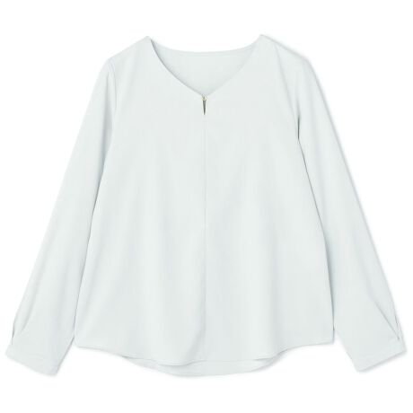 襟ぐりが開き過ぎていない、フロントのメタルホックを留めて着るプルオーバーブラウスです。