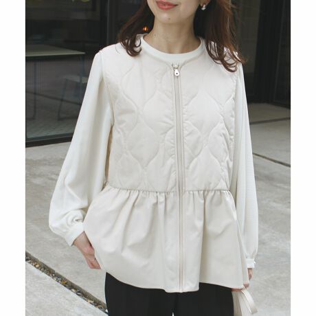 丸みのあるキルティングを施した生地に、ペプラムデザインを組み合わせたジップベスト。