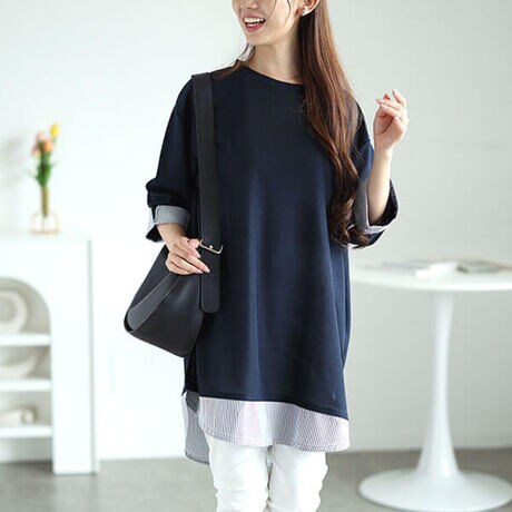 一枚で綺麗めカジュアルコーデが完成するフェイクレイヤードチュニックの登場です。ワッフル&布帛生地の異素材使いなのでお気に入りのボトムスに合わせるだけで、こなれ感を纏ったレイヤードコーデが完成☆お尻が隠れるしっかり長めの着丈で気になるお腹周り&腰回りをすっぽりカバーしてくれるのも嬉しいポイント!デイリーやお出かけ使いはもちろんお仕事シーンでも◎