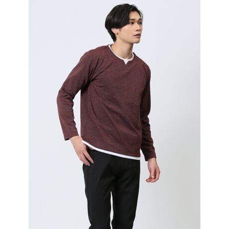 トップスを二枚重ね着したように見える、キーネックの長袖Tシャツです。衿・裾部分のフェイクレイヤードで高見えするルックスに仕上げています。一枚で着るのはもちろん、ジャケットやシャツ、ベストのインナーとしても便利なアイテムです。