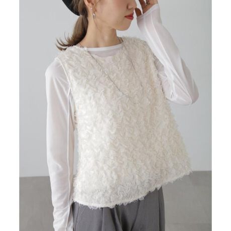 華やかな印象のノースリーブブラウス。シャギー素材にカットワークを施しオーガンジーフリルをミックスした立体感のある素材を使用しています。クルーネックでフロントはスッキリとさせ、後ろネック部分は金属ジップで、甘さの中にカジュアルな印象をプラスしました。裏地付きなのも嬉しいポイント。デニムやナロースカートと合わせてのスタイリングがおススメです。※モデルの着用画像の場合、光の当たり具合により、実際の色味と異なって見えることがございます。色味は、商品単体の画像をご参照ください。