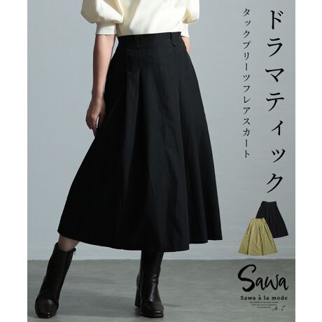 【スカート】 タック プリーツ ギャザー フレア ハイウエスト ゴム ミモレ丈 ポケット 黒 緑