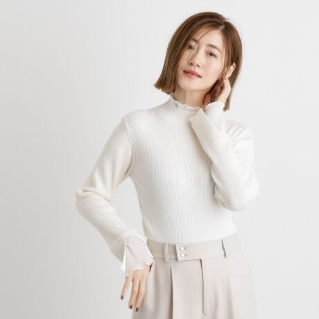 衿ぐりと袖口から覗くプリーツフリルが華やかなレイヤード風ドッキングニットプルオーバー。