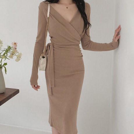 カシュクールのVネックでデコルテをキレイに見せてくれるニットワンピースが登場♪<br>