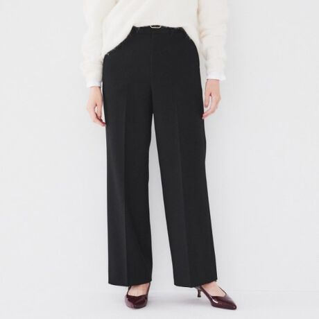 迷っていたピンクベージュをセールで購入。パジャマっぽく見えるかなと思いましたが、トップスに気をつければ大丈夫そう。ということで、カラーは気に入りました。生地が固いかな?と思いましたが、比較的柔らかく動きやすいと思います。最近のパンツはストレートデザインが多いですが、とろみのない生地でタックなしのストレート、しかも短めとなるとのっぺりズドンと短足に見える。。それが流行りなのか好評なのか?モデルさんでさえちょっとどんくさく見えるのは私だけ? 個人的には股上も深すぎてウエストとヒップの差がほとんど出ず、腰回りがズドンとなるのも気になります。タックありでフルレングス、落ち感があって裾がなびくような、ワイドだけどバランスのとりやすいパンツが出てほしいです。