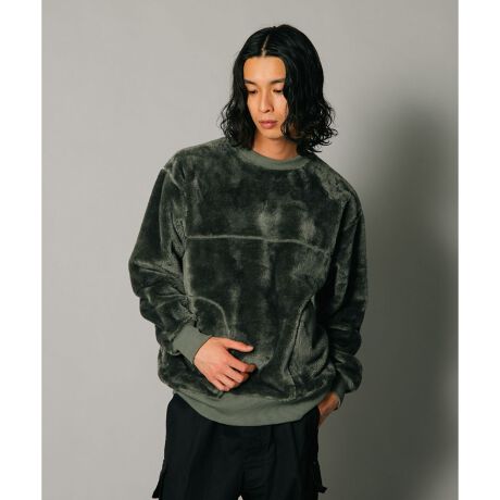 柔らかく軽いボアの裏面に肌触りのいい天竺素材を貼り合せたオリジナル素材です。ベーシックなトレーナータイプで、同じ素材のパンツとセットアップもおすすめです。ドロップショルダーでサイズも大き目なのでトレンドのビッグシルエットとしてルーズに着こなせます。もこもこの肌ざわりが気持ちいい1着です。