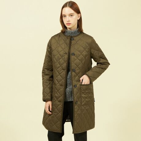 <ノーカラータイプのキルティングロングコート>