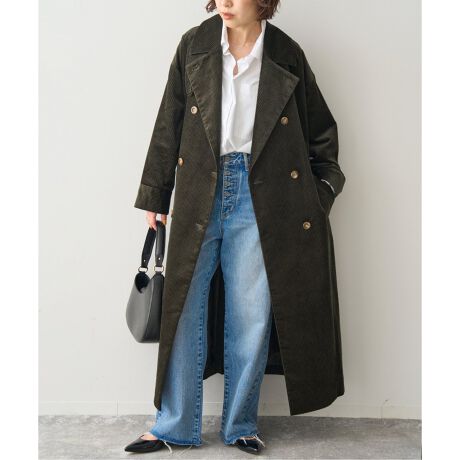 光沢感のある上品なコーデュロイを使用し、ゆるっと女性らしい柔らかいシルエットのトレンチ型のデザインは女性らしくもマニッシュで大人な印象に。