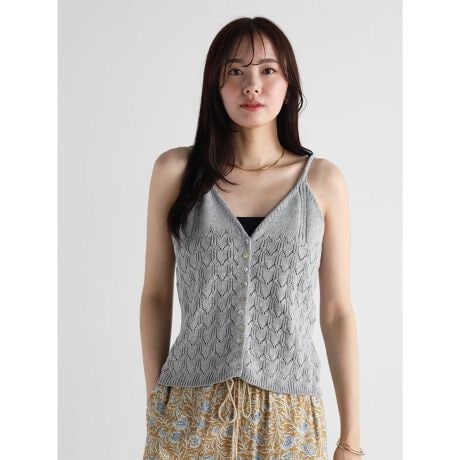 編みのパターンとフロントのシェルボタンがアクセントに。