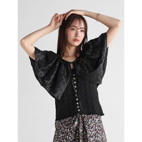 編みのパターンとフロントのシェルボタンがアクセントに。